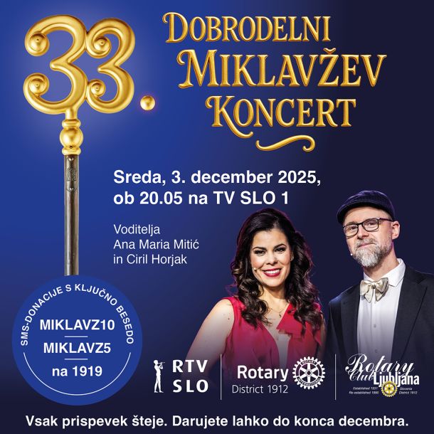 Tradicionalni dobrodelni Miklavžev koncert v organizaciji RTV Slovenija, Rotary kluba Ljubljana in Rotary Districta 1912 je namenjen zbiranju sreds...